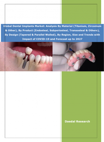The report titled “Global Dental Implants Market: Analysis By Material (Titanium, Zirconium & Other), By Product (Endosteal, Subperiosteal, Transosteal & Others), By Design (Tapered & Parallel Walled), By Region, Size and Trends with Impact of COVID-19 and Forecast up to 2027”, includes: