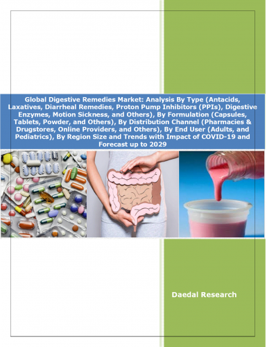 Global Digestive Remedies Market: Analysis By Type (Antacids, Laxatives, Diarrheal Remedies, Proton Pump Inhibitors (PPIs), Digestive Enzymes, Motion Sickness, and Others), By Formulation (Capsules, Tablets, Powder, and Others), By Distribution Channel (Pharmacies & Drugstores, Online Providers, and Others), By End User (Adults, and Pediatrics), By Region Size and Trends with Impact of COVID-19 and Forecast up to 2029